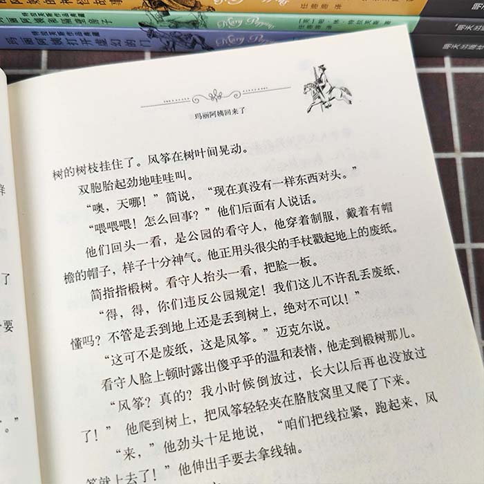 本丛书是引进自英国的一套家喻户晓的奇幻文学作品。特拉芙斯笔下的玛丽阿姨是世界文学史上占有重要地位的、为数不多的人物形象。玛丽阿姨是个神通广大、心地善良的保姆,她不停地为孩子们创造了他们只有在梦中才能见到的奇迹。 《玛丽阿姨回来了》 在这一部里,玛丽·波平斯从云端的风筝线上飘然而至。在她的照顾下,班克斯家的孩子们会见了国王和他的傻瓜,以倒竖蜻蜓的方式拜访了颠倒先生和他的新娘,并用气球飘在公园上空,度过了一个美好的下午……