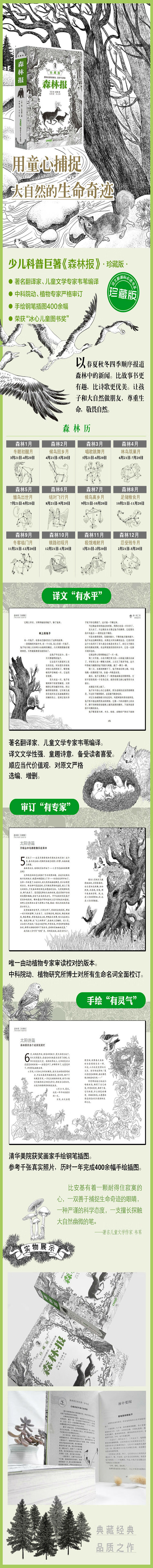 告诉你森林里发生的真实故事想知道森林里藏着什么秘密吗丶?什么鸟儿喜欢用尾巴唱歌?什么动物在冬天产下宝宝?《森林报(珍藏版)》会告诉你答案。《森林报》用童心讲述森林中发生的真实故事,让你由此爱上大自然,了解大自然,成为未来的自然科学家!927年,这本神奇有趣的书与读者见面。儿童科普作家维·比安基性地以报刊分栏形式,按照四季的顺序,以细致的笔法和富有感染力的语言讲述森林里发生的种种趣事。此后,经过数十年修订、扩充,不断加入新的作者和内容,它最终成为科普文学的经典之作。你眼前的《森林报(珍藏版)》是它的一个精美岔图、新,特别收录手绘岔图近四百幅,由翻译家、诗人、儿童文学研究专家韦苇翻译,并由分别从事植物、动物研究工作的刘夙博士和朱磊博士进行了严谨校订。书中营造的黑白森林世界优美、真实,并可借其中出现的三百余个动植物名词得以“多识于鸟兽草木之名”。