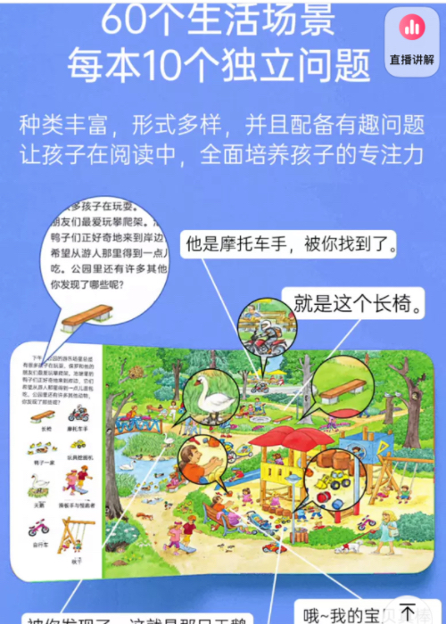 1专门针对1-4岁宝宝设计,贴合成长需求 2通过日夜变化主题,激发宝宝的好奇心 3精美插图+互动设计,吸引宝宝长时间专注 4潜移默化培养观察力、理解力和想象力六本书都讲了啥? 每本书都贴切生活并通过不同场景展现: 1《丰收的农场》:认识农场动物的日常生活 2《交替的白天与黑夜》:探索城市日夜的不同面貌 3《可爱的动物》:认识不同生存环境下的可爱动物 4《充实的一天》:观察不同生活场景中的人间百态 5《奔跑的交通工具》:观察不同的交通工具 6《繁忙的建筑工地》:体验建筑工地的繁忙节奏妈妈使用小贴士 让宝宝从右面的插图中找到左面插图位置 鼓励宝宝描述画面,锻炼语言能力 设计互动游戏,如模仿书中动物 结合实际生活,帮助宝宝理解日夜概念 耐心陪伴,让阅读成为亲子互动的快乐时光 宝宝专注力提升小测试 看完一本书后,试试问宝宝这些问题: 书中有哪些小动物? 每种交通工具的名字是什么? 白天和晚上的颜色有什么不同? 你最喜欢哪个场景?为什么?3精美插图+互动设计,吸引宝宝长时间专注 宝宝能回答得越来越好,就说明专注力在提高哦!