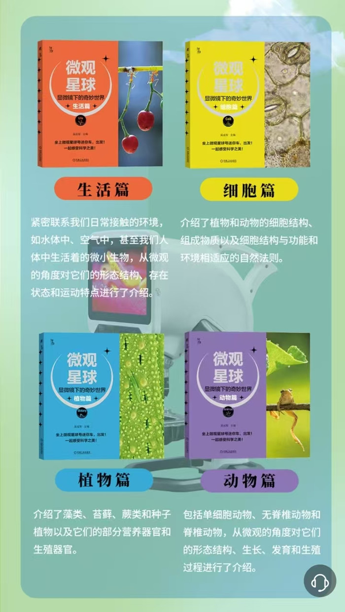 这是一本关于数码显微观察的套装图书,由生活篇、细胞篇、植物篇和动物篇组成,囊括59个主题。内容涉及生物、化学、物理等多学科。用深入浅出、生动有趣的内容和近1000幅令人惊艳的数码显微镜原创图片,为读者带来了微观世界的美和专业的科学知识。生活篇紧密联系我们日常接触的环境,如水体中、空气中,甚至我们人体中生活着的微小生物,从微观的角度对它们的形态结构、存在状态和运动特点进行了介绍。细胞篇介绍了植物和动物的细胞结构、组成物质以及细胞结构与功能和环境相适应的自然法则。植物篇介绍了藻类、苔藓、蕨类和种子植物以及它们的部分营养器官和生殖器官。动物篇包括单细胞动物、无脊椎动物和脊椎动物,从微观的角度对它们的形态结构、生长、发育和生殖过程进行了介绍。适合青少年阅读,也适合一线教师和广大微观爱好者阅读。