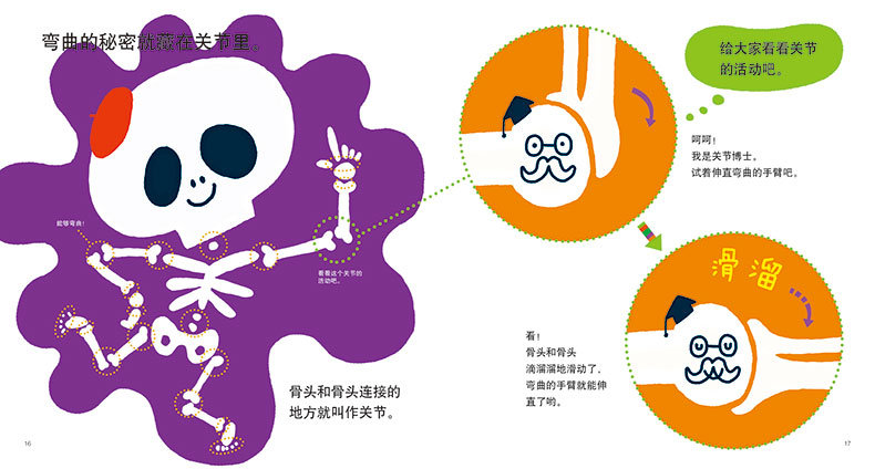 处于生长发育期的孩子往往会对自己的身体充满好奇,为什么要刷牙,为什么会拉便便,为什么摔伤了会流血,为什么会感冒,为什么要吃新鲜蔬菜,等等。如何让幼小的孩子明白这些问题,绘本以富有童趣的故事和简洁呆萌的画面做了完美解答。该套书共有8册:《牙齿的故事》《便便》《睡觉啦》《别输给感冒啊》《神奇的感觉》《身体里出的东西》《很好吃的》《骨头君》。每册一个主题,例如,《牙齿的故事》中,绘本讲述两位70岁高龄的爷爷和奶奶:爷爷因为小时候各种不良习惯,所以造成老年牙齿全脱,只有靠戴假牙吃东西;奶奶却是从小爱护齿,定时去看牙医,一口牙齿白又亮,吃什么都香。绘本让孩子们在了解自己身体的同时,理解良好生活习惯的重要性,从而自觉改掉一些坏习惯。绘本体贴入微地讲述了各种好习惯的生活细节,是2—6岁小朋友的健康必备书。