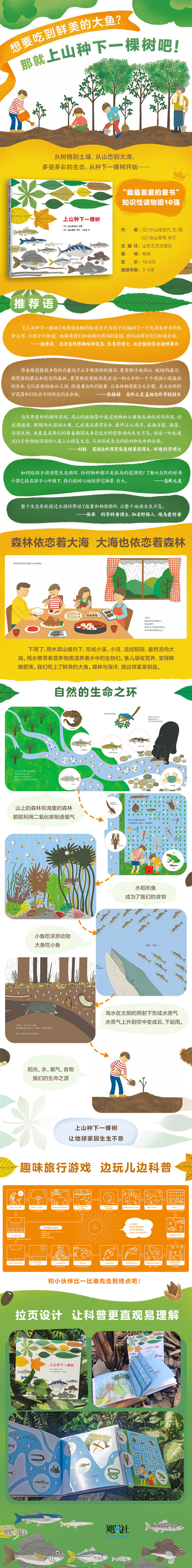 精巧的折页设计,帮助孩子清晰地认知生命的循环。 上山种下一棵树,也在孩子的心里种下好奇的种子! 获“我*喜爱的童书”知识性读物组10强。 想要吃到鲜美的大鱼,就上山种下一棵树吧。大自然的循环系统,多么令人惊叹! 从树梢到土壤,从山峦到大海,感受神奇的物质循环和生命循环,从种下一棵树开始…… 森林依恋着大海,大海也依恋着森林,大自然中的一切生命相互依存,和谐共生。