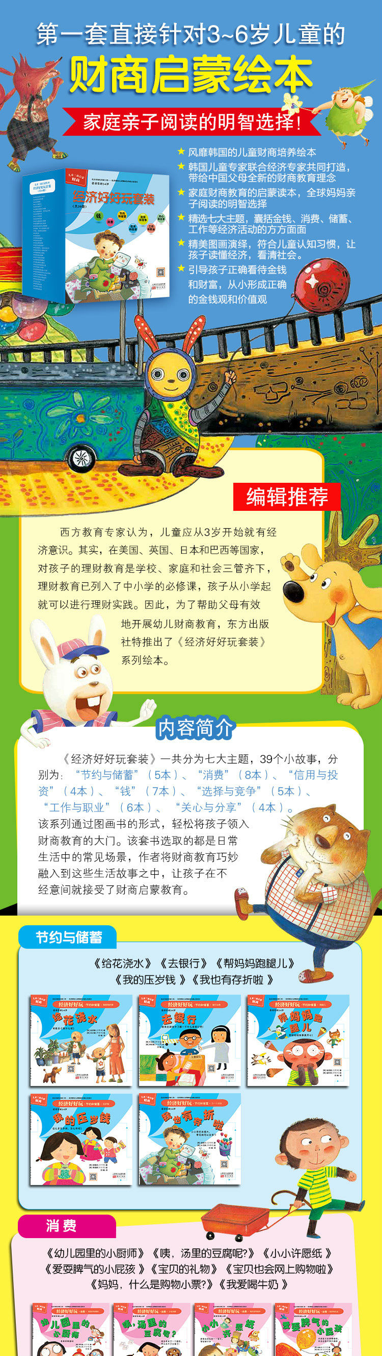 该套书选取的都是日常生活中的常见场景,将财商教育巧妙融入到日常生活之中,让孩子在不经意间就接受了财商启蒙教育。该系列一共39本,囊括了经济生活的方方面面,包括辨认钱币,认识币值,也包括制定用钱计划,买卖交易,甚至还包括节约储蓄,信用卡,税收,评价商业广告,竞争等比较深一些经济知识。