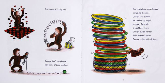 黑黑的眼睛,开心的神情,跃跃欲试的动作——好奇心盛的乔治是孩子们的化身,他的幽默是儿童式的幽默,他的冒险故事展现的是孩子们天马行空的想象力。每次在“黄帽子”先生嘱咐小乔治一定不要怎样怎样之后,小乔治都会惹出麻烦;不过,那些小小的教训从不会让他气馁,他不停地探索世界上的新鲜事儿。好奇猴的作者Hans Augusto说,“我知道我孩提时代喜欢的是什么,所以我不会创作任何一本我作为小孩子不会喜欢的书。”