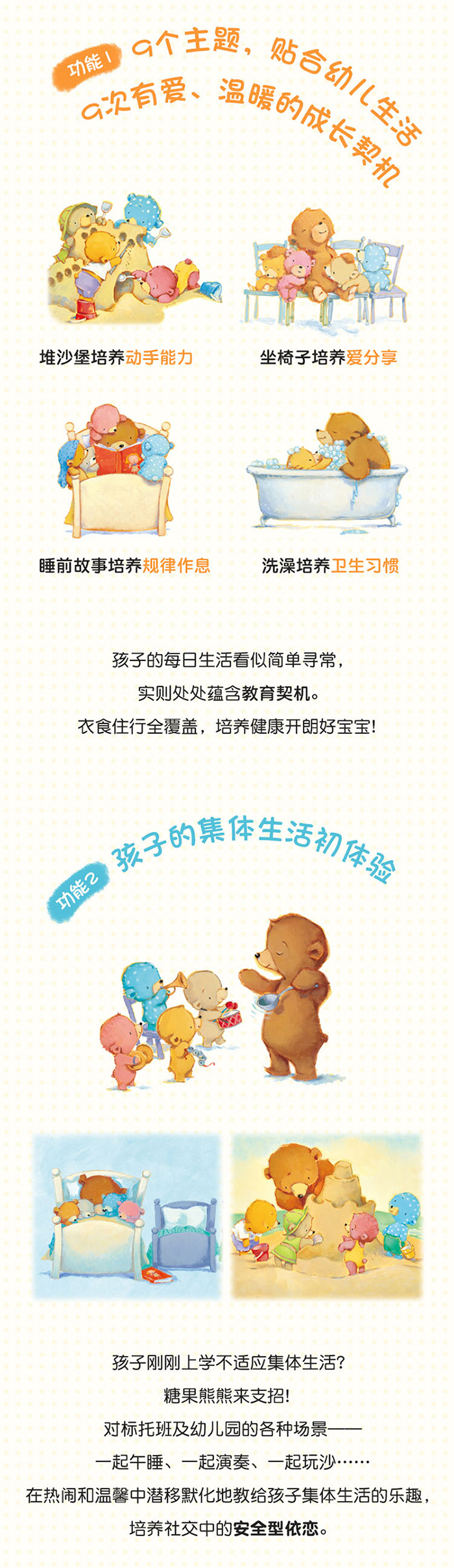 这套书为0-6岁孩子打造,在朗朗上口的文字中,小读者可以看见许多熟悉的生活情境。大熊小熊给每个小朋友带来有爱、温暖的生动细节,更与小朋友一起学习关照朋友、携手成长。