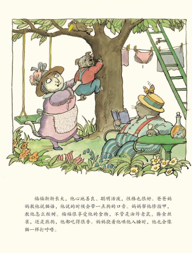 这只幸运的狗狗正是如此,因为有了父母爱意满满的陪伴,他找到了自己的成长方式:他学会了猫的语言,吃猫的食物,甚至睡觉时也跟猫一样打呼噜;他发明游戏自己跟自己玩;他成绩优异,是学校里出类拔萃的学生;他会拉小提琴,还加入了管弦乐队……