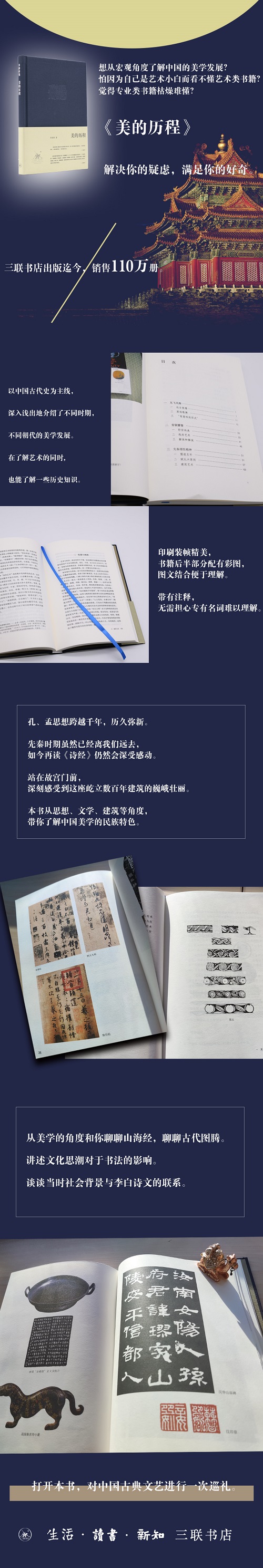 《美的历程》是中国美学的经典之作,凝聚了作者李泽厚先生多年研究。他把中国人古往今来对美的感觉玲珑剔透地展现在大家眼前,如斯感性,如斯亲切。其中提出了诸如原始远古艺术的“龙飞凤舞”,殷周青铜器艺术的“狞厉的美”,先秦理性精神的“儒道互补”,楚辞、汉赋、汉画像石之“浪漫主义”,“人的觉醒”的魏晋风度,六朝、唐、宁佛像雕塑,宋元山水绘画以及诗、词、曲各具审美三品类,明清时期小说、戏曲由浪漫而感伤而现实之变迁等等重要观念,多发前人之所未发。此书于一九八一年初版,多次再版重印达几万册。