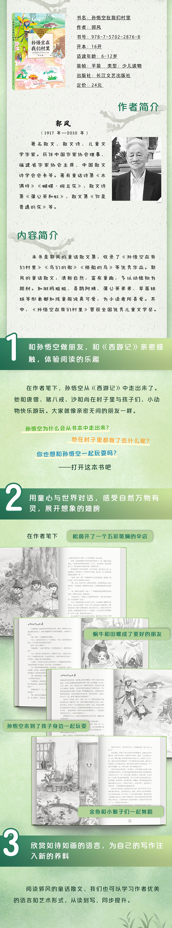 本书是郭风的童话散文集,收录了《孙悟空在我们村里》《鸟们的歌》《搭船的鸟》等优秀作品。郭风的童话散文,清新自然,富有童趣,多以动植物为题材。如斑鸠姐姐、喜鹊阿姨、蒲公英弟弟、草莓妹妹等形象都如孩童般纯真可爱,为小读者所喜爱。其中,《孙悟空在我们村里》曾获全国优秀儿童文学奖。
