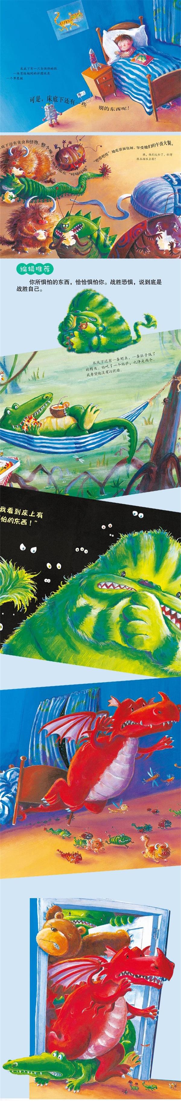 轻松风趣地赶走恐惧 资深编辑 龚慧瑛 这是一本为胆小的孩子量身订做的图画书,这是一本帮助胆小的孩子战胜恐惧的图画书。如果你恰好有一个害怕在黑夜里独自睡觉的宝宝,那就不妨和他(她)一起读读这本有趣的书,说不定还能为他(她)壮壮胆子呢! 推荐这本书,是因为它与众不同的视角和讲述故事的方式:并非像大多数作品那样完整而细致地展示孩子害怕独自睡觉的心理活动和种种行为,浓墨重彩地渲染恐怖的气氛,时刻把读者的心揪得紧紧的;相反,这本书自始至终都在以一种轻松、风趣、调侃的笔调描绘那些床底下的怪物,直到*后才将“镜头”从床底下拉到床上,推出那个大大的、具有震撼力的“你”——原来,正是这个作为人的“你”(即孩子),吓得床底下的怪物们“跌跌撞撞、失魂落魄”地逃窜!“现在,床底下什么怪物也没有了。”全书到这儿戛然而止。看似轻描淡写的一笔,却既让人释怀,又令人回味。它其实是在含蓄地告诉孩子:你所惧怕的东西,恰恰是惧怕你的东西。战胜恐惧,说到底就是战胜自己——因为,那些床底下的怪物在现实生活中并不存在,它们都是你自己一手制造出来的。 全书分两个层次来证明这一点。在*个层次里,作者写了正在享受午夜大餐的臭虫和怪物、正在打瞌睡做美梦的龙、吃比萨的鳄鱼和挠痒痒的灰熊,营造出一种悠闲、安适的氛围,并且一次又一次地强调他们“根本顾不上你”,以此来松弛胆小孩子原本绷紧的神经。 接下来,是一个不能不提的“过门”,它处在两个层次之间,是全书至关重要的转折点:那个比马棚还要大的东西突然发现床上有一个“可怕的东西”,居然吓得“从脚趾头到脑袋都在发抖”! 进入第二个层次后,作者似乎改变了风格,竭尽全力地制造出一种紧张的气氛。但是,如果你稍加留意的话,就不难发现:他其实仍然在以那种风趣调侃的方式游刃有余地指挥着怪物们狼狈逃窜,把读者的视线也引得东奔西突,而那个导致这场大逃亡的“可怕的东西”却化作一个大大的问号同读者玩起了捉迷藏的游戏,直到*后才现出真身——这简直有点希区柯克的味道了! 全新的视角,丝毫也不说教,让孩子以一种放松的心态来听一个原本叫人发怵的故事——这就是《床底下》藏着的成功秘密。 美术欣赏 一场稀释恐惧的梦幻剧 文/ 周翔 每个人都经历过恐惧,虽然谈论这一话题对缓解恐惧心理会有一定帮助,但就事论事是不够的。用艺术来诠释恐惧,将它转变成一定形状、色彩的物体以表达难以言表的感受,才利于稀释我们内心的恐惧。《床底下》就是一本稀释幼儿恐惧心理的佳作。恐惧的色相一般与黑、蓝黑、紫蓝、冷灰等色系接近。这些色相,通过画家内心的“反刍”会让人感到阴森的气氛。 《床底下》在稀释恐惧时,却避免了上述色相的使用,而是选择了暖色系列来照亮令孩子害怕的床底下的黑暗世界。随着孩子翻阅一幅一幅亮堂堂的画面,恐惧的阴影也随之一点一点离开他们的心头。明亮的画面语言不仅帮助孩子阅读故事,并且帮助他们克服了恐惧心理。 首先,在大面积的湖蓝色相的背景下,幕布样式的蓝色条纹被子覆盖着床沿,它在预告这是一场梦幻剧。 接着,随着大幕的拉开,角色开始上场: 红的、绿的怪物们极不协调地出现在黄色调背景上,暗示着这是一个充满荒诞情节的剧目。 接着,在连续的画面里,画家用蓝与红补色的对比,表现了懒散的大龙;用绿色色系表现了悠闲的鳄鱼。注意:鳄鱼是躺在蓝色条纹的吊床上的,与*幅中孩子盖的蓝色条纹被子相一致。画家用鲜艳的颜色描绘所有的怪物,并且在造型上把他们弄成了类似上发条的玩具,让其在画面上跑动、跳跃、强化了梦境的荒诞效果。 再接下来,一道横穿画面的黄色分开了黑暗,梦幻剧情在此转折,暗示了怪物们退场的方向,让所有的角色随着梦境奔向故事的结尾。 最后,演出结束。耀眼的白色好似灯光通明,这场梦幻剧的“主角”微笑着向我们致意。不知道幕布再次拉开时,又会是一场什么样的剧目呢?