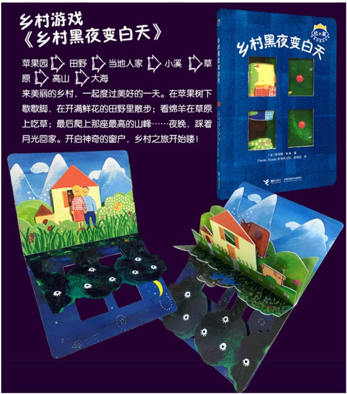 《乡村黑夜变白天/杜莱百变创意玩具书》讲述乡村美好的一天。在苹果树下歇歇脚,在开满鲜花的山野里散步。看绵羊在草原上自由自在地吃草……夜晚,踩着月光回家。轻轻翻开书,立刻出发!