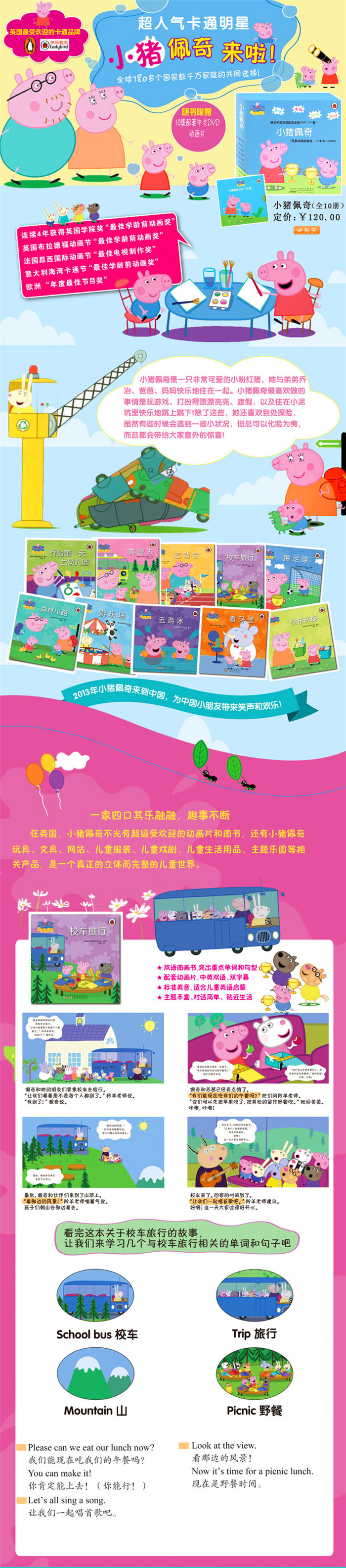 小猪佩奇是一只非常可爱的小粉红猪,她与弟弟乔治、爸爸、妈妈快乐地住在一起。小猪佩奇最喜欢做的事情是玩游戏、打扮得漂漂亮亮、渡假,以及住在小泥坑里快乐地跳上跳下!除了这些,她还喜欢到处探险,虽然有些时候会遇到一些小状况,但总可以化险为夷,而且都会带给大家意外的惊喜!