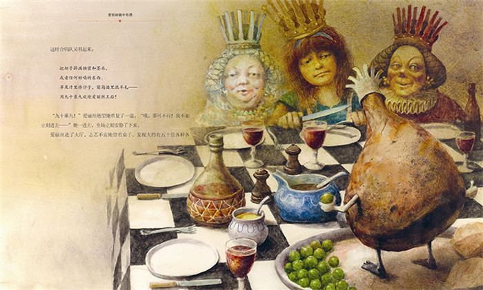 “噢!亲爱的,别装出那副模样!”她喊道,忘了国王根本听不到,“你害我笑得那么厉害,几乎拿不稳了!嘴巴别张得那么大!灰都要进去了―好啦,你现在够干净的了!”她替他把头发抚平,把他挨着王后放在桌上。