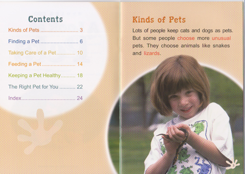培生幼儿英语?提高级:这个级别一共有24本+CD3张,分别为橙色(8本)、浅蓝色(8本)、紫色(8本)。这个级别针对5-7岁的孩子,本级的主要目标培养孩子的语感,通过熟知的单词与句子,猜测一些生词的意思。本级共有450个左右的单词,单词量有很大的跨越。句子从每页2-3句增加到每页5-6句,但是都是简单句式的语句,有助于孩子阅读与理解。并且通过反复出现的单词和不断重复的句式,加深孩子的记忆与理解。除了故事外,本级还有一些启蒙科普读物,比如让儿童了解怎样选择宠物、怎样照顾宠物,有关鲸鱼的知识,了解非常野生动物园等这些孩子比较感兴趣的内容。
