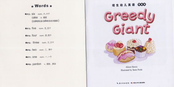 培生幼儿英语?预备级:这个级别一共有35本+CD2张,分别为粉色和红色。这个级别针对3-4岁的孩子,它主要以单词和词组为主,共有200个左右的单词。本级的主要目标是让孩子建立起英语与常见物品之间的联系。例如:以公园为主题,学习公园里的游乐设施;以生日为主题,学习孩子过生日会收到的生日礼物;以公主和龙的故事,学习幻想世界中的单词;以巨人的故事,学习1-5个数字;以我喜欢的小汽车的故事,学习颜色;以小狗的故事,学习孩子在生活中常见的名词;以宠物的故事,学习小动物;以真实的图片,学习小昆虫,大与小等等。除此之外,还会学到常见的水果、五官、食物、动物的单词。