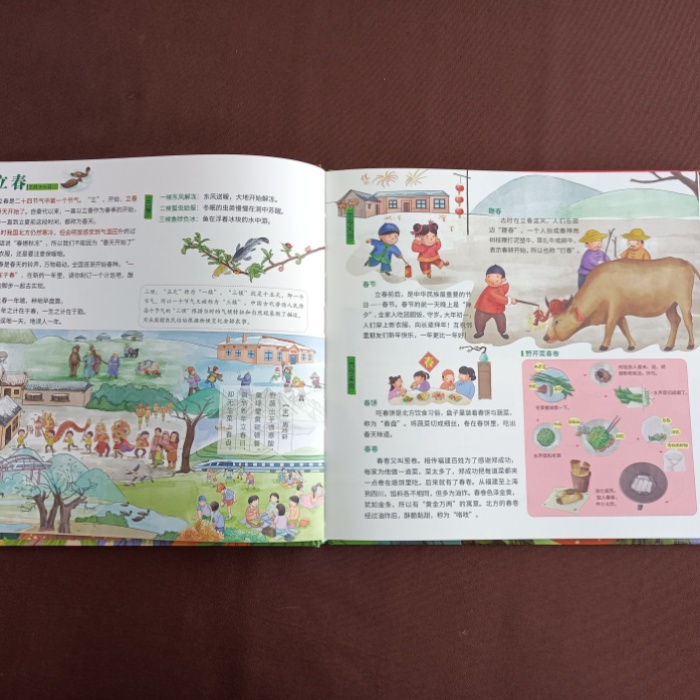 二十个节气,大自然的味道。人们敬仰自然,用节日标记了自然的颜色,用习俗表达着对生活的美好愿意。小朋友们,这是一本描绘节气的画,画着植物的春绿秋黄,画着动物的夏长冬藏,画着习俗的美好愿望,画着五千年山高水长