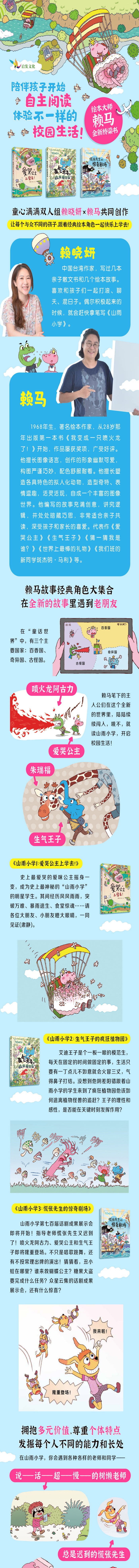 赖马重磅新书来袭: 山雨小学第一辑全3册【超值赠送:文件夹3个 书签3个 笔记本】 山雨小学1:爱哭公主上学去! 山雨小学2:生气王子的疯狂植物园! 山雨小学3:慌张先生的惊奇剧场! 童心满满双人组赖晓妍×赖马共同创作“山雨小学”系列桥梁书第一集!打破传统学习框架,让每个与众不同的孩子,跟着经典绘本角色一起快乐上学去! ★赖马经典角色大集合!读赖马的绘本长大的小粉丝们,可以在全新的故事里遇到很多老朋友 ★爱哭公主的校园生活充满冒险与乐趣,轻松有趣的校园适应范本 ★图画内容丰富,漫画版的画面,适合刚刚开启自主阅读的小读者 ★故事幽默治愈,用搞笑情节化解成长烦恼,拥抱多元价值,尊重个体特点 ★SEL社会情感学习,积极帮助孩子解决校园生活面临的同侪压力、情绪管理、社交挑战等问题 ★新故事,老朋友★在“童话世界”,有三个主要国家:百香国、奇异国、古怪国。爱哭公主、喷火龙阿古力、生气王子……赖马笔下的小主人公们在这个全新的世界里,陆陆续续闯入,哦不,就读山雨小学,开启校园生活! ★拥抱多元价值的神奇学校★ 在山雨小学,会遇到哪些人?说——话——超——慢——的数学老师,声音洪亮的超元气健康课老师,什么样的老师都有!爱哭的同学,会喷火的同学,超级会写卡片的同学,什么样的同学都有! 山雨小学重视“逃生演习”、运动、游泳技能、饮食教育,提倡拥抱多元价值,发掘每个人不同的能力和长处,尊重孩子的个体特点。 ★SEL社会情绪学习★ 新学校一个人都不认识怎么办?新环境不熟悉怎么办?会不会走错班?在“山雨小学”系列中,用搞笑情节化解成长烦恼,幽默治愈。 ★漫画般的阅读体验★ 分格与跨页交错的页面安排,对话与旁白采用不同的设计,搭配表情包般夸张的表情和动作,给小读者带来漫画般的阅读感,适合5岁以上孩子自主阅读。超多图画细节,每次阅读都能有新发现。