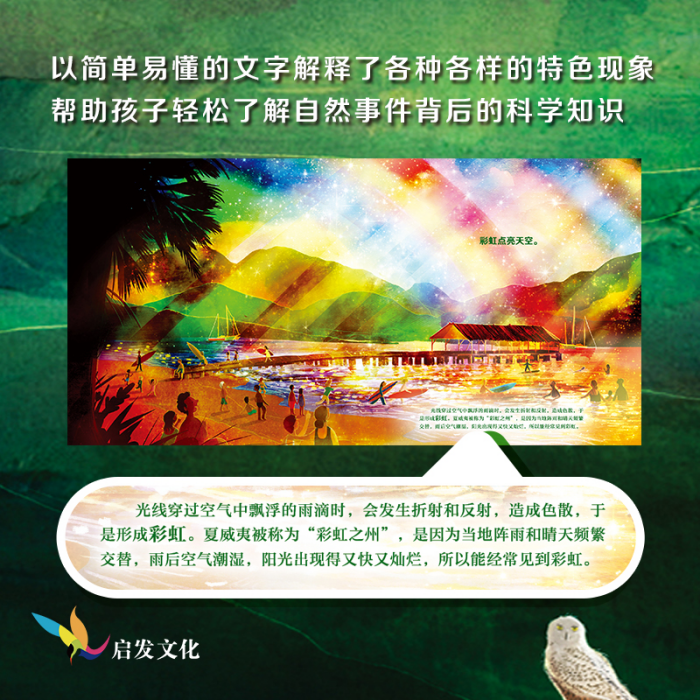 下雨过后,人们在夏威夷的海边看见呈现奇幻色彩的彩虹;摄影师躲在镜头后面,看见日落的金色阳光洒在非洲动物身上,展现出奇异的光影;或是在城市的夜空,一轮明月高挂天空,照亮遥远的天际线,以及坐在篝火旁的一家人,抬头仰望天空中华丽的流星雨…… 你会看见有许多自然现象能让天空闪闪发亮——日出日落、闪电风暴、满月、彩虹、极光、流星雨、火山爆发,甚至是求偶中的萤火虫——这些照亮天空的现象就像变魔术一样神奇,但其实背后都有一个吸引人的科学解释。