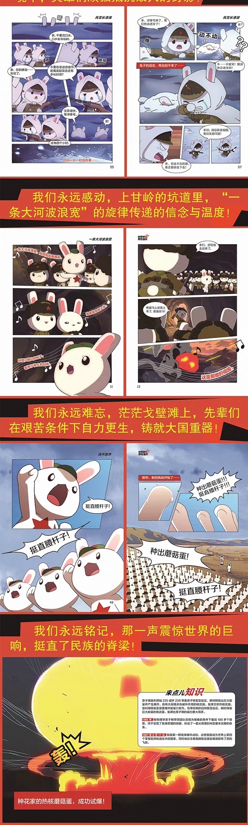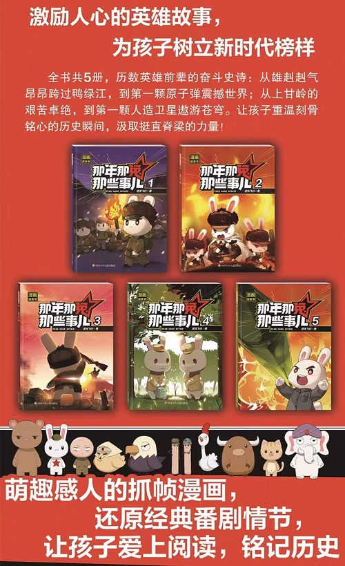 这是一套改编自热播动画《那年那兔那些事儿》的抓帧漫画 书,用二次元漫画讲述热血爱国故事,用可爱的兔子、狡猾的鹰 酱、凶残的脚盆鸡等动物角色表现近现代的重大历史事件。 动画原作自2015年上线播出,十年间已播出七季拥有一大批 核心忠诚粉丝。IP全网粉丝突破两千万,微博“那兔”话题阅读 量超过1亿, 本书一方面秉承原作正能量爱国主题;另一方面采用抓帧漫 画形式,以轻松趣味的画风讲历史故事,全书设计围绕青少年群 体的心理特点和习惯,故事超燃,台词幽默充满热血激情,让读 者在笑中有泪中感受国家民族一路走来的不易。