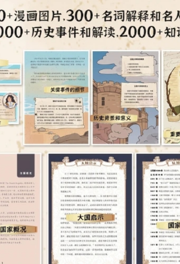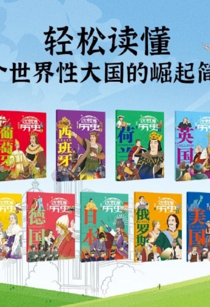 这就是历史 9个世界性大国300名词解释和名人介绍400漫画图片 1000*历史事件和解读 2000知识点 用漫画和故事讲述历史 用看懂世界的眼光看到未来 每 个时代的一粒沙,落在个人头上都是一座山。 何谓时代? 何谓国家?何谓世界? 何谓历史? 人类历史上的“大国”不胜枚举,不乏灿烂辉煌、声名赫赫之辈,但真正称得上“世界性”的,还是要从航海大发现,整个世界版图在人类面前徐徐展开之后说起。你可知欧洲小国葡萄牙和西班牙曾在地球上画了一条线打算瓜分世界;“风车之国”荷兰曾控制了全球一半的国际贸易;“弹丸之地”日本又是如何革除积弊一步步成为东方帝国? 《这就是历史》中,将15世纪以来,葡萄牙、西班牙、荷兰、英国、法国、德国、日本、俄罗斯、美国的重要发展节点串联成简史,9个世界性大国的历史线又互相交织和推进,由点成线,再由线成面地展现全球历史。 书中还对政治名词、关键事件、重要人物、历史背景和意义等进行了注释和解读,添加了国家概况、国家简史以及大国启示等,力求让更多人能更简单地以更高的视角看到更远的世界。 正如本书中所讲到的大国,无一例外都会重视年轻人对世界的探索和学习那样,希望《这就是历史》能够为青少年打开一扇远视的窗口,让他们向光生长,在未来的某一天面向世界开花结果,助力中华民族的伟大复兴