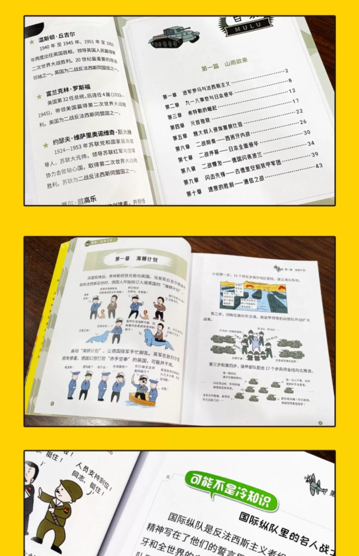 第二次世界大战持续六年之久,席卷 ,是人类历 迄今为止 残酷的战争。 本书以时间为主线,选取二战中的主要战场、重点事件、风云人物来描绘战争的轮廓,以风趣幽默的语言演绎历史的沉重。全文共分8个篇章。“漫话二战”勾勒战争的整体面貌,“山雨欲来”讲述法西斯和军国主义的发展,“初尝胜利”描绘战争初期轴心国的冒险,“疯狂挺进”展现战势扩展期侵略者的疯狂,“伟大转折”刻画反法西斯同盟的不屈不挠,“末日序曲”和“诸神黄昏”展现法西斯和军国主义的 终命运,“解秘二战”则是战争中的逸闻故事。 我们铭记残酷的历史、 的浩劫、无尽的灾难。历史也让我们 加懂得和平的珍贵与美好。