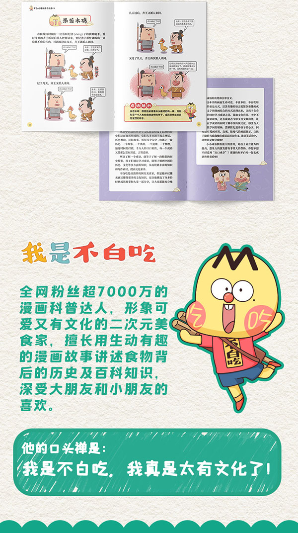 ◆ 全网超7000万粉丝二次元漫画家“我是不白吃”重磅新作,跟着不白吃,爆笑学成语,出口成章不用愁! ◆ 你还在死记硬背四字成语吗?你还在褒贬不分,乱用成语吗?“废寝忘食”这个成语原来是孔子的故事吗?“妄自菲薄”这个成语源于诸葛亮劝谏刘禅?结合趣味故事,用活泼有趣的漫画,让繁杂难懂的成语变得轻松易读,让孩子领略成语之美、汲取传统文化营养。 ◆ 【学习成语】是小学生语文的刚需,通过这套书囊括文史、国学等方面知识;听说读写,积累写作素材,得高分;善用典故,开眼界!还能提高思辨能力:人生故事中得来的启发与哲思 ◆ 读完趣味故事,看成语出处来源:监守自盗,原来出自《汉书·刑法志》,买椟还珠的故事出自《韩非子·外储说左上》,含原文、注释、译文,并标明名著名篇出处,顺便学习历史、领略国学文化的魅力 ◆ 注重成语运用,手把手教你用在写作文、演讲中,再也不乱用成语,为写作文提分,提高自信成为社交小达人 ◆ 全套五册,精选100个中小学生常用成语故事,提高你的语言表达能力,增长见识,提分宝典 ◆ 不白吃系列图书深受多地学校老师和学生的喜爱,谨以此书献给渴望知识、热爱美食的大人和小孩,做一个有文化的吃货! ◆ 高品质全彩漫画,超大16开,字号大,符合小读者阅读要求,随书赠不白吃国学动画,书内扫码,开启趣味国学之旅