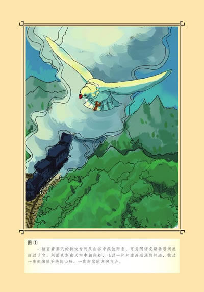 阿诺克斯受命出发了。时间在一分一秒地流逝,一个小时过去了,两个小时过去了,三个小时也快要过去了。这时,一颗蓝色的流星裹挟着风声,从外面呼啸着飞了进来(运用借喻的修辞手法,既体现了阿诺克斯最突出的形象特点,又表现了其飞行速度之快),阿诺克斯回来了!比利立刻关上门逮住了它,熟练地从它身上取下信卷,交给银行家。银行家紧张得面色苍白,手忙脚乱地打开信卷,看完之后,他的脸色很快好转起来:“感谢上帝!我得救了!”他立刻把生意成功的好消息告诉了大家。