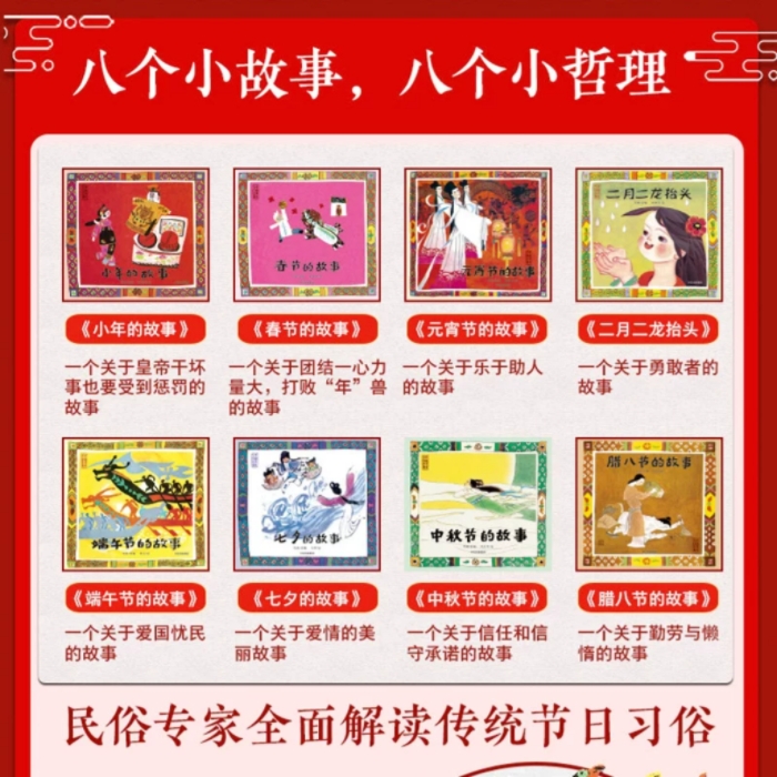 本书属于儿童文学类图书。本书是一套专为3-6岁儿童设计的原创绘本,共8册,包括《小年的故事》《春节的故事》《元宵节的故事》《二月二龙抬头》《端午节的故事》《七夕的故事》《中秋节的故事》《腊八节的故事》。对中华民族悠久的农耕文明而言,时令节气是非常重要的。这套书旨在让每个孩子了解自己的传统节日,了解源远流长的中华文明。本册内容:讲述了一个与灶王爷有关的故事。相传曾经有一位馋嘴的皇帝,他闲逛到一个村子,遇到了会做好吃的枣糕的美丽姑娘。于是皇帝想把姑娘占为己有。谁知这位姑娘是一位仙女,为了惩罚贪吃的皇帝,仙女把他贴到了灶台上。从此以后贪吃的皇帝变成了灶王爷。
