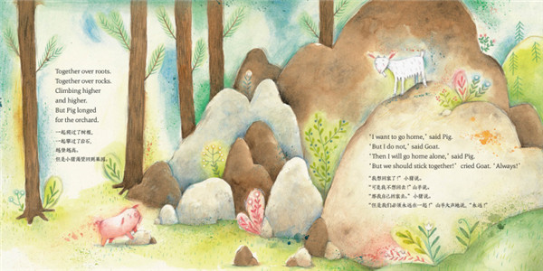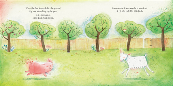 他们找到了适合自己的生活。山羊在高高的山脊上跳跃,日子新鲜而有趣;小猪在懒散的果园里打盹儿,日子闲适而自得。独自一个人的时候,小猪会学着山羊的样子寻找方向,讲山羊讲过的故事;山羊难以入眠的时候,也会哼小猪哼过的小曲儿,他们学着解决问题,就像好朋友还在身边一样。