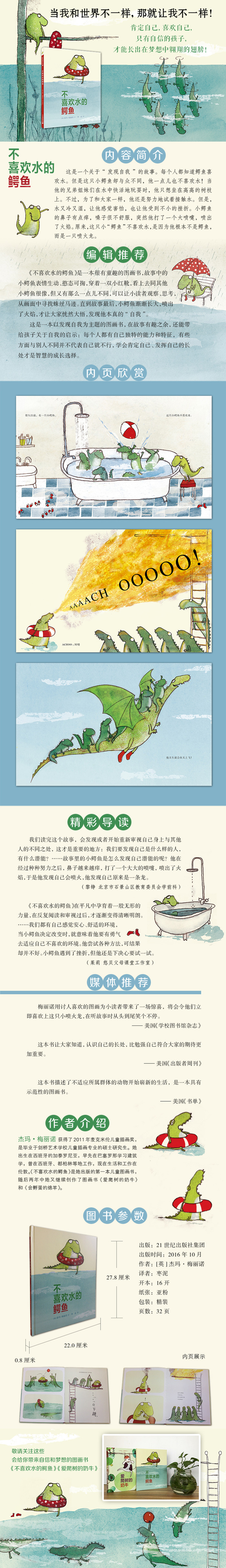 《不喜欢水的鳄鱼》是一本很有童趣的图画书,故事中的小鳄鱼表情生动、憨态可掬,穿着一双小红靴,看上去同其他小鳄鱼很像,但又有那么一点儿不同,可以让小读者观察、思考,从画面中寻找蛛丝马迹。直到故事后,小鳄鱼渐渐长大,喷出了火焰,才让大家恍然大悟,发现他本真的“自我”。 这是一本以发现自我为主题的图画书,在故事有趣之余,还能带给孩子关于自我的启示:每个人都有自己独特的能力和特征,有些方面与别人不同并不代表自己就不行,学会肯定自己、发挥自己的长处才是智慧的成长选择。