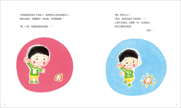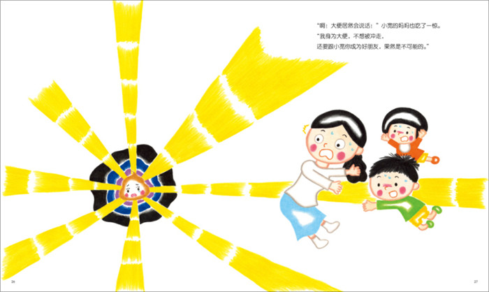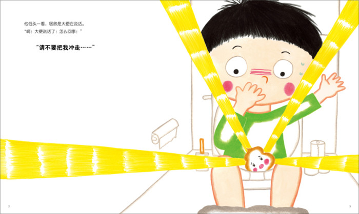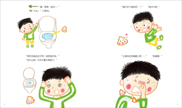 但在《便便公主》里,大便居然说话了:“我们交个朋友吧!”她化身为可爱又缠人的便便公主,对小男孩小宽提出各种请求:“请不要把我冲走”“我们交个朋友吧”“真希望能听到有人说喜欢我”……让小宽无法拒绝,也讨厌不起来。便便公主和小男孩直接看似不可思议的对话,让每个读到的孩子都哈哈大笑,又不知不觉感受到大便的重要。