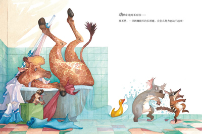 一只泡在浴缸里的长颈鹿,听起来似乎不太可信!不过,如果真的让孩子们看见这样的场景,他们是不是会乐得哈哈大笑呢?飞在天空中的青蛙、正在淋浴的绵羊、打喷嚏的猫头鹰、蹲在马桶上的袋鼠、穿着时髦的鳄鱼、跳草裙舞的河马……都在本册绘本变为了真实的场景。如果这些还不能博得孩子们的欢笑,那么——请再读一遍!
