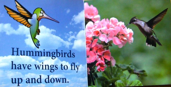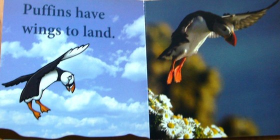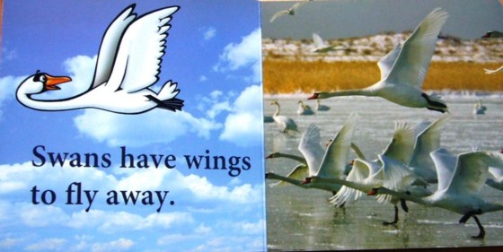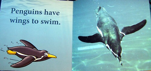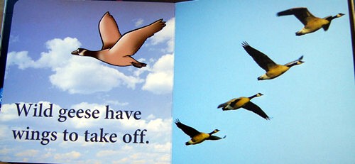 每页一个动物,都是有翅膀的,但是功能不同。都用一句话做了说明,天鹅的是用来fly away,蜂鸟的fly up and down,Puffin(查了词典叫海雀)的用来land,野鹅的用来take off,企鹅的用来swim。