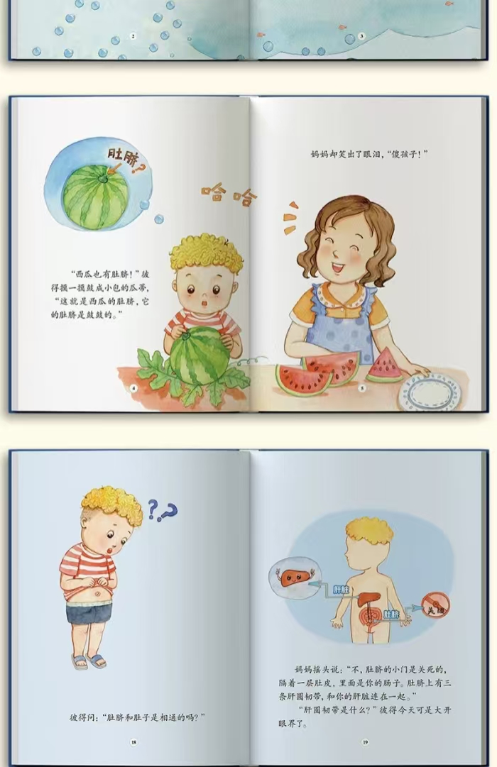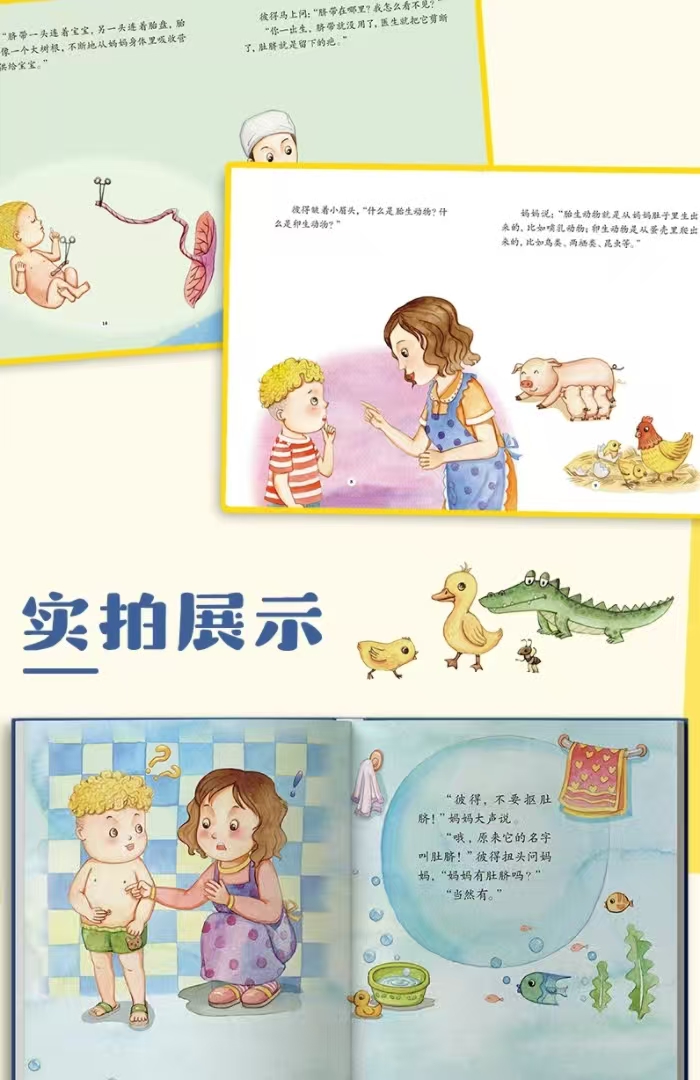 该绘本讲述了彼得发现自己肚皮上有个像酒窝一样的东西,那就是肚脐。妈妈告诉他不要抠肚脐,并向他解释了肚脐的作用,原来胎生动物都有肚脐,它是胎儿时期连接脐带的地方,通过脐带,宝宝可以从妈妈那里获得养分和氧气。脐带上有血管,与人体内脏相连,如果把肚脐抠破,细菌就会进入人体,危害健康。彼得听后再也不敢抠肚脐了。