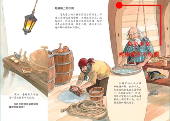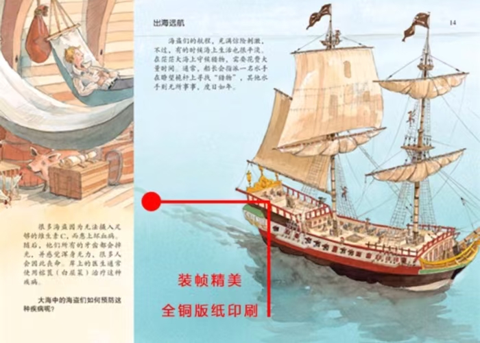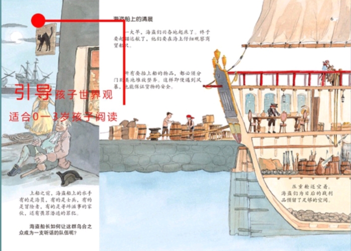 由德国克里斯塔·赫尔泰著的《打开历史:海盗来了》,由江西教育出版社出版,该书讲述了海盗的历史、日常生活、行事作风等内容,如水手在船上的饮食、饮用水的获取、水手结的打法、对目标船只的进攻方式、海盗旗的样式以及战利品的藏匿地点等,以小读者的视角解读历史,书中还有图有故事,每个小活页下面都有意想不到的惊喜 。