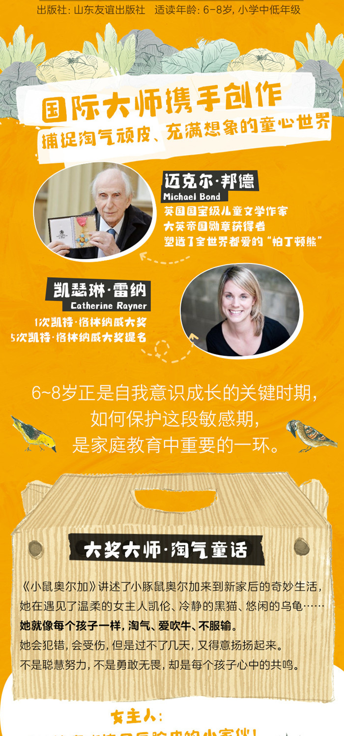 全世界小孩都喜欢的豚鼠来了!英国儿童文学作家、“帕丁顿熊之父”迈克尔·邦德,携手多次荣获凯特·格林纳威奖插画师凯瑟琳·雷纳,再现儿童淘气顽皮、充满想象的内心世界。 《小鼠奥尔加》系列是《小熊帕丁顿》的姊妹篇,讲述了一只顽皮的小豚鼠从宠物店被领回“新家”之后的种种奇遇,有和新主人之间信任的建立,有和宠物猫、乌龟和刺猬之间友谊的发展……奥尔加可不是一个乖巧听话的小家伙,恰恰相反,她和所有顽皮的小孩一样,有很多缺点:爱恶作剧、爱说大话、不服输、自我意识爆棚、胆小却硬要装作很勇敢……她的到来,把原本平静的一家闹得“天翻地覆”,可她又像所有来到新家庭的孩子一样,给家人带来了甜蜜的负担。 小豚鼠奥尔加的故事自问世之后加印、再版无数,版权已输出美国、德国、法国、芬兰等多个国家,此版《小鼠奥尔加》系列故事是与牛津大学出版社合作、专为低年级孩子定制的精品桥梁书版本。