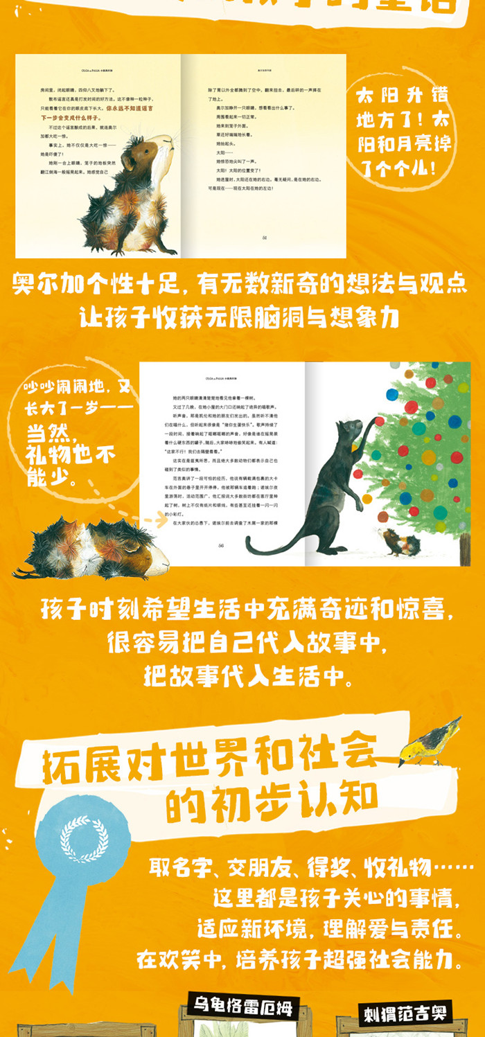 全世界小孩都喜欢的豚鼠来了!英国儿童文学作家、“帕丁顿熊之父”迈克尔·邦德,携手多次荣获凯特·格林纳威奖插画师凯瑟琳·雷纳,再现儿童淘气顽皮、充满想象的内心世界。 《小鼠奥尔加》系列是《小熊帕丁顿》的姊妹篇,讲述了一只顽皮的小豚鼠从宠物店被领回“新家”之后的种种奇遇,有和新主人之间信任的建立,有和宠物猫、乌龟和刺猬之间友谊的发展……奥尔加可不是一个乖巧听话的小家伙,恰恰相反,她和所有顽皮的小孩一样,有很多缺点:爱恶作剧、爱说大话、不服输、自我意识爆棚、胆小却硬要装作很勇敢……她的到来,把原本平静的一家闹得“天翻地覆”,可她又像所有来到新家庭的孩子一样,给家人带来了甜蜜的负担。 小豚鼠奥尔加的故事自问世之后加印、再版无数,版权已输出美国、德国、法国、芬兰等多个国家,此版《小鼠奥尔加》系列故事是与牛津大学出版社合作、专为低年级孩子定制的精品桥梁书版本。