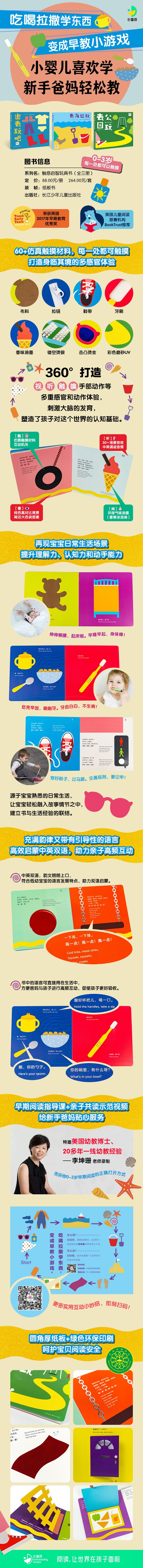 小宝宝对生活中一切事物天生充满好奇心和探索欲,正是在不断地看一看、摸一摸、闻一闻、尝一尝、听一听的过程中,小宝宝展开了对环境中一草一木,一人一物的探索,这种探索就是学习的过程。而对孩子来说,手的重要性在3岁以前堪称“第二大脑”,手部动作的发展直接影响着大脑的发育。这套《触感启智玩具书》除了具有触摸认物的功能外,通过60多种仿真触摸材料和互动机关,360°打造视、听、触、嗅、手部动作等多重感官和动作体验,促进孩子感官的开发。 《触感启智玩具书》共含3册,按照孩子的成长规律和探索世界的顺序去编排,从孩子出生起的日常起居,到穿戴整齐准备出去玩,到去家附近的公园探索,再描写到去更远的地方小宝宝和一家人去沙滩探索自然,三本书覆盖到了孩子生命初识阶段的生活,像连续剧一样陪伴着孩子一起去探索世界。 这套书是中英文双语对照的双语书,书中的文字都是日常的高频短语和词汇,句子简单易懂,表达精准读起来朗朗上口,轻松打造双语环境!
