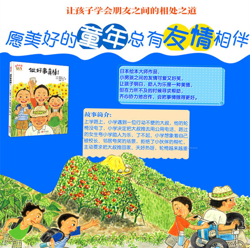 小太上学途中遇到一个残疾大叔,在帮他推车的过程中,路过的女同学们夸他,小太觉得自己助人为乐,很了不起。两个小伙伴来帮忙,他坚决地拒绝了。天那么热,越来越累了,汗流浃背了,遇到上坡,推不动了呀。就在这时,一直跟在旁边的两个小伙伴出手相助了……