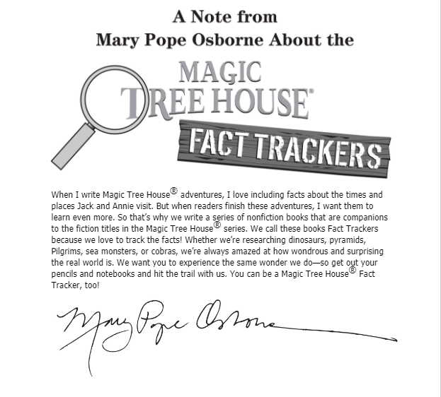 Filled with up-to-date information, photographs, illustrations, and fun tidbits from Jack and Annie, the Magic Tree House Fact Trackers are the perfect way for kids to find out more about the topics they discover in their favorite Magic Tree House adventures. And teachers can use Fact Trackers alongside their Magic Tree House fiction companions to meet Common Core text pairing needs.