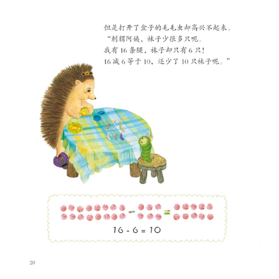 刺猬阿姨最会织袜子了,那袜子软软的、暖暖的,穿起来真舒服!青蛙、螳螂、毛毛虫也来找刺猬阿姨了,它们各有多少条腿呢?毛毛虫拿到袜子很伤心,因为刺猬阿姨只给它织了六只,它其实有十六条腿。这是怎么回事呢?