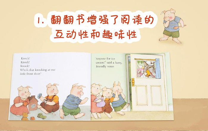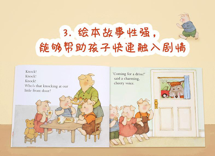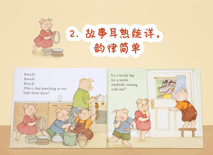 【推荐】 这个英文故事共有五个段落,每个段落从相同的敲门声开始,而小猪也重复了五次一模一样的询问:konck!knock!knock!who's that knocking at ourlittle front door?之后野狼无论是兜售冰激凌、邀约兜风、玩耍或游泳,三只小猪一概拒绝并马上关门。 重复性在英文学习初期扮演极重要角色。没有什么比再重复的话语更容易达到学习效果的了。幼教专家曾指出,孩子在接触新事物时,总是希望有断重复好让他能对陌生内容逐渐熟悉直到完全掌握而感到安心。