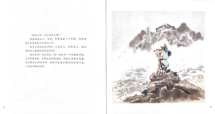 《神话中国绘·治水的大禹》一书中讲述了大禹的爱情。两个人的爱情,甜蜜、芳香。对他们而言,世界因有彼此而温暖、而美好。“人们叫她涂山氏。对于大禹,她叫阿娇”。因为有了爱情,大禹这个神,有了人性的魅力。本系列绘本讲述中国古代神话宏伟、壮阔的幻想,瑰奇、绚烂的构思,歌颂中华祖先博大坚韧、自强不息、勇武刚健的民族精神。文字作者周静老师的文本不仅仅是看到古人,我们的神有“人性”,能走进孩子们内心深处成为支撑他们成长的人。通过新童话艺术,以一个一个具体可感的的形象,实现以古神话为依托的童话化的新历史叙事。插画作者钱定华老师采用最传统、朴实的写实手法,用诗一般的构图意境来描绘大禹和涂山氏那感人肺腑的情景画面。