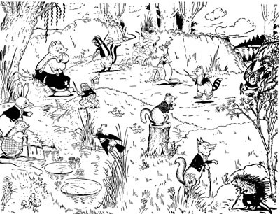 浣熊鲍比和臭鼬吉米正在咬耳根。他们相互咬耳根的时候,你大可认定他们正在准备捉弄某人。是的,朋友们,浣熊鲍比和臭鼬吉米凑到一块儿,咬耳根的时候,肯定会有人将会遭受他们的戏弄。要是彼得兔看见了他们混在一起,他绝对不会像现在这么轻松自在的。他正忘情地想让自己看起来显要,好配得上自己的新名字。他端着架子,趾高气昂地离开绿森林,到微笑池塘去拜访麝鼠杰里。