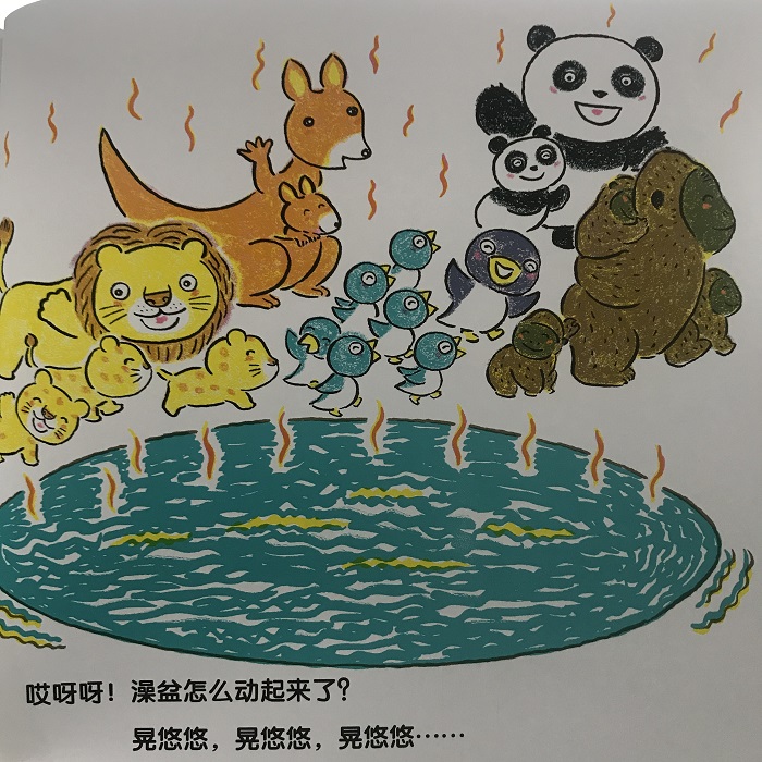 《动物园里的大澡盆》 动物园关门后,动物园园长和动物们一起洗澡。大象来晚了,只能在小澡盆里洗,不过动物宝宝很开心,因为他们有了专属的“大象滑梯”。