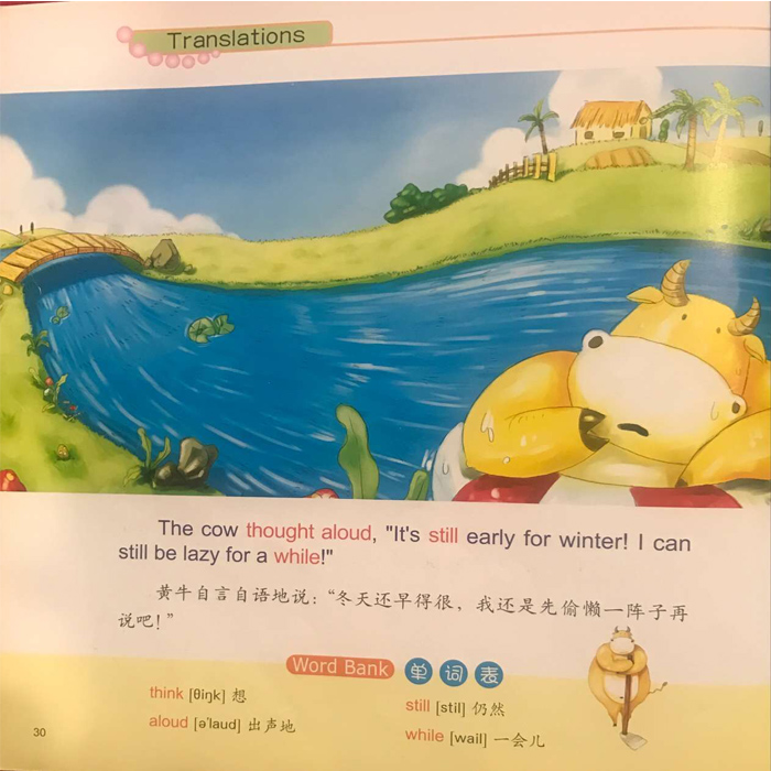 故事中的大黄牛在整个夏天都因天气炎热而懒懒散散地泡在水里,什么事也不做,是一个贪图享乐又懒惰的动物。反观它的邻居大水牛,不畏炎热,每天挥汗如雨地在田地里勤奋工作,播种、插秧、除草,积极地为冬天储备粮食。转眼到了冬天,大水牛把收获的粮食搬进屋里,而大黄牛才想起要种田。但是遍地的积雪,大黄牛根本无法耕种,这下子他终于尝到了贪图享乐的恶果。