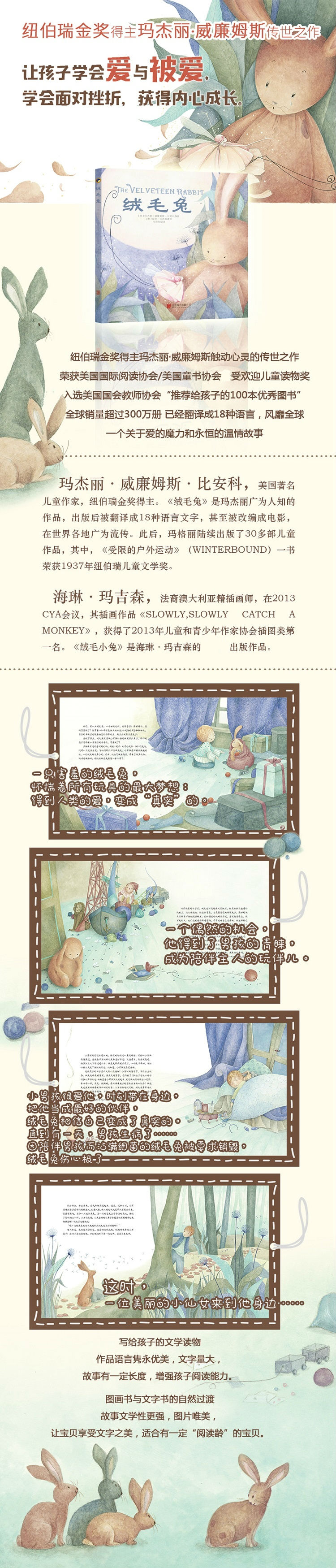 《绒毛兔》是享誉世界的美国经典童话,由著名儿童文学作家玛格丽威廉斯创作,出版后深受小读者的喜爱,并迅速成为家喻户晓的童话故事,在全世界被翻译成十几种语言出版。画家以精细、传神的笔触与经典故事文本相融合,将故事温馨、魔幻的氛围渲染得淋漓尽致,完美地表现出绒布小兔子和小男孩之间深刻浓厚的爱。