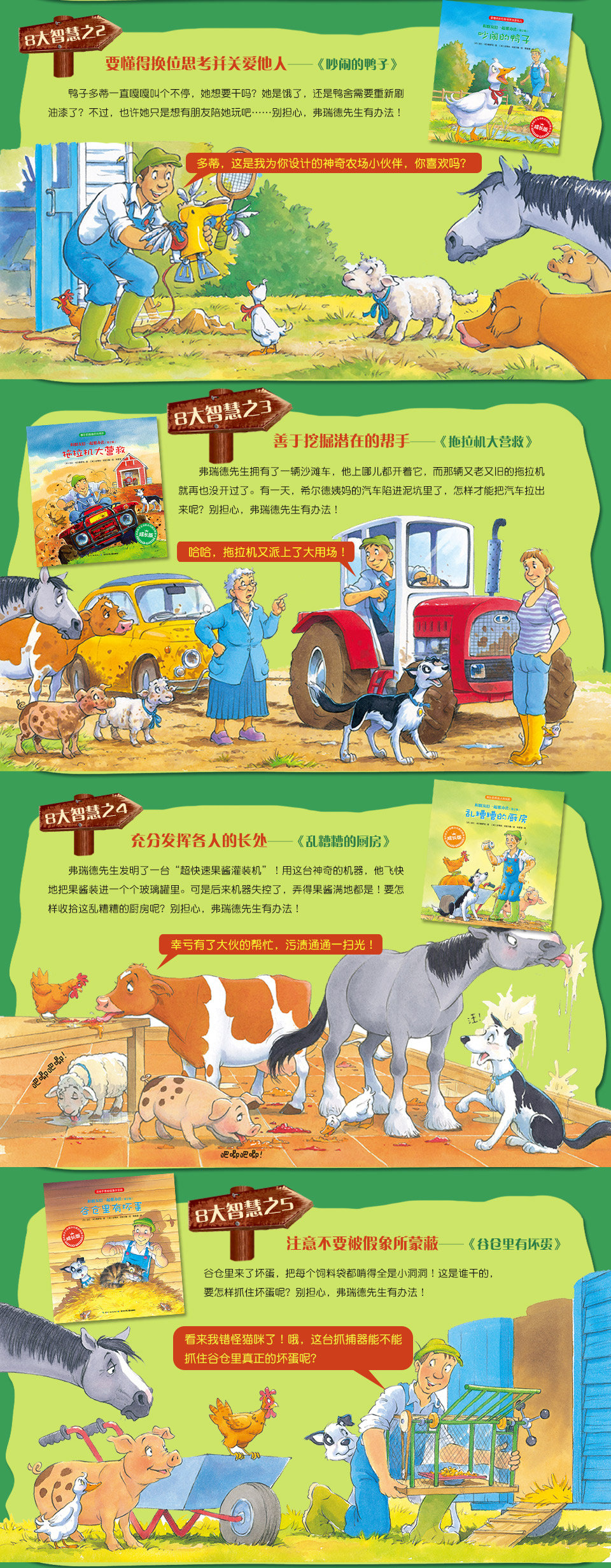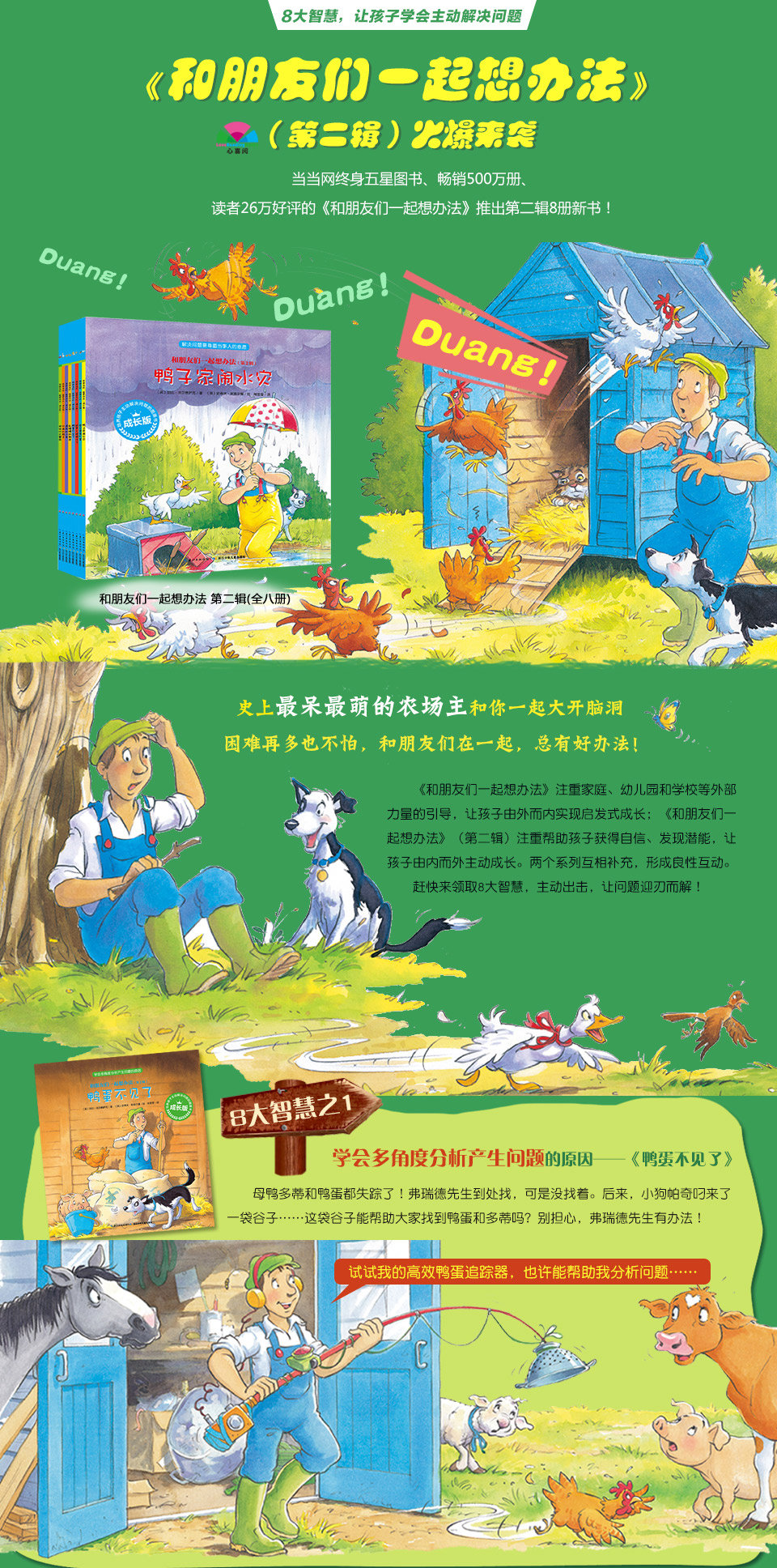 《和朋友们一起想办法》(第二辑)系列延续并深化《和朋友们一起想办法》系列培养孩子“想办法,解决问题”的主题,通过生动有趣的农场故事,结合精心设置的导读和互动,帮助孩子学会主动地解决问题。《和朋友们一起想办法》注重家庭、幼儿园和学校等外部力量的引导,让孩子由外而内实现启发式成长;《和朋友们一起想办法》(第二辑)注重帮助孩子获得自信、发现潜能,让孩子由内而外主动成长。两个系列互相补充,形成良性互动。