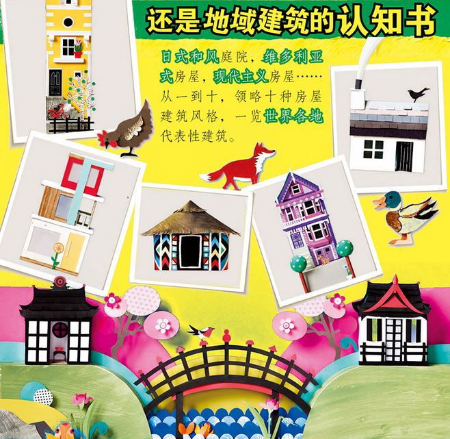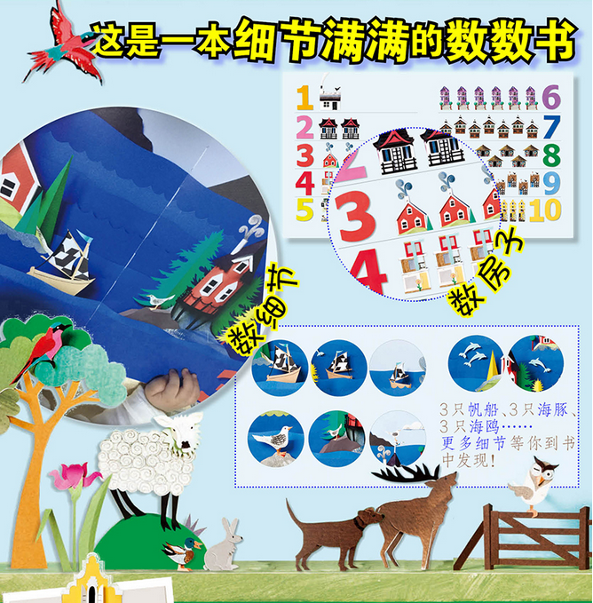 这是一本来自世界著名出版社Laurence King的绘本。这本书教孩子认知数字,全书没有故事情节,仅仅以数数为基本内容。该书作者为英国著名的纸艺大师,她将世界各大洲具有代表性的地理、建筑、文化等通过纸张拼贴的手法表现出来。每一个数字,均由一个代表性建筑表现。作者将纸张的颜色、肌理与剪贴相结合,在二维平面上塑造出了浅浮雕的立体效果,画面兼具装饰与童趣。本书结束前,对各大洲建筑的特点做了知识性普及,便于家长带领孩子阅读时的知识补充。国内市场上的数字认知的绘本中,用这种表现手法来教孩子数数的,实属空白。该书的出版,将会给中国孩子带来全新的体验——认知与艺术相结合,寓教于乐。