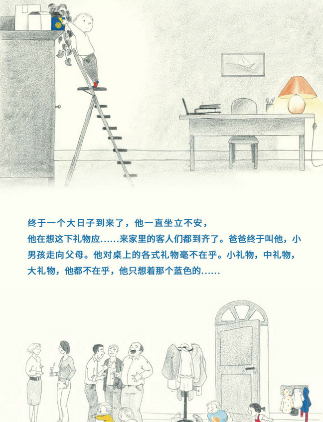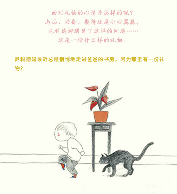 《礼物》采用独特的水彩加铅笔的绘画方式,使画面轻盈灵动、诙谐幽默,配以简单有趣的文字,情节设计富有悬念,娓娓道来一个暖心的故事,表达了孩子对父母纯洁的爱,引导孩子们在尼科德姆的故事中学会认识自己、勇敢地表达自己。