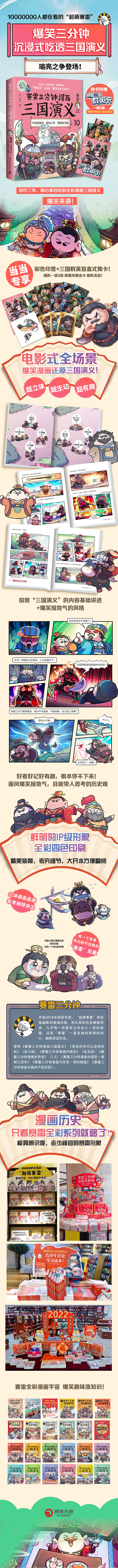 《三国演义》是古代中国非常重要的长篇章回体历史小说。以立体生动为擅长的赛雷,正是要创作这样一套立体生动全场景呈现三国历史的作品。第10本主要集中在关羽大战黄忠、瑜亮之争、曹操除马腾等经典场景,生动地再现三国场景,让读者在哈哈大笑中了解三国的历史。 它突出的地方就在于用赛雷漫画的幽默风格按时间线索将三国的历史讲述出来,让读者在哈哈大笑中知晓三国历史的发展脉络。